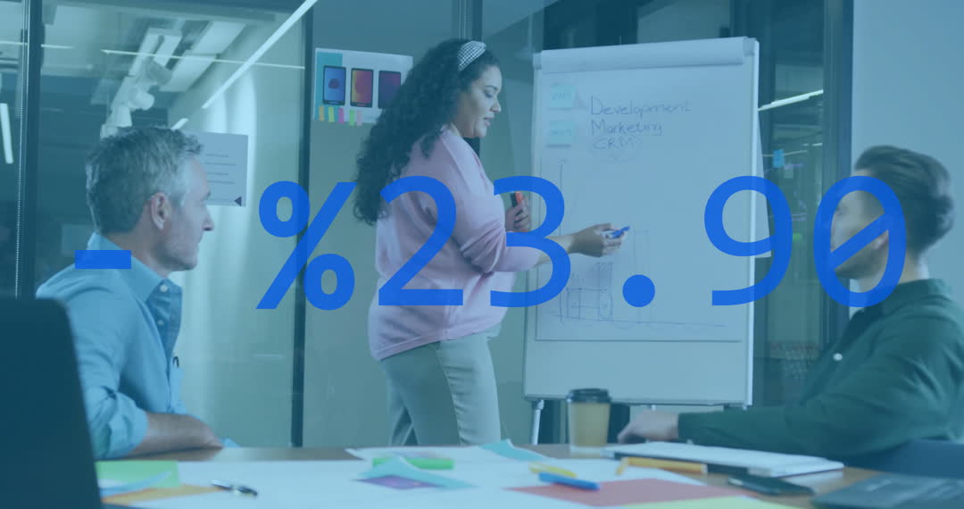 A diverse group of colleagues gathers around a whiteboard in a modern office environment, with one team member explaining concepts such as development and CRM. Bold numerical and data symbols digitally overlay the scene, indicating focus on data processing and analytics. Suitable for content emphasizing teamwork, innovation, and modern business practices. Ideal for use in corporate branding materials, presentations on collaborative work strategies, or visually engaging business reports.