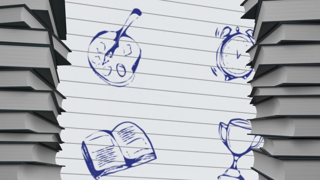 Illustrations showcasing school concept with stacks of books and sketched icons of education themes like a clock, a trophy, an open book, and a painting palette. Useful for educational articles, promotional materials for schools, e-learning programs, and creative workshops aimed at students.