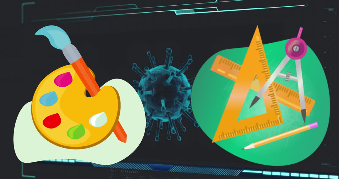 Illustration merging scientific and artistic elements with a virus diagram in digital composition, including art tools like a palette and brush alongside geometric drawing tools. Useful for themes on bridging disciplines, innovation in medical fields, STEAM education, and creativity in scientific research.