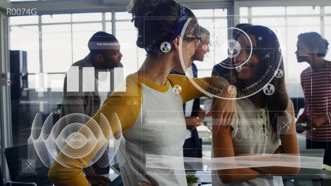Young executives engaging in conversation while observing virtual data interfaces in a modern office space. Displays futuristic technology concepts with overlaid digital elements on a workplace setting. Ideal use for illustrating corporate culture, innovative technological domains, or teamwork and collaboration concepts in marketing and presentation materials.