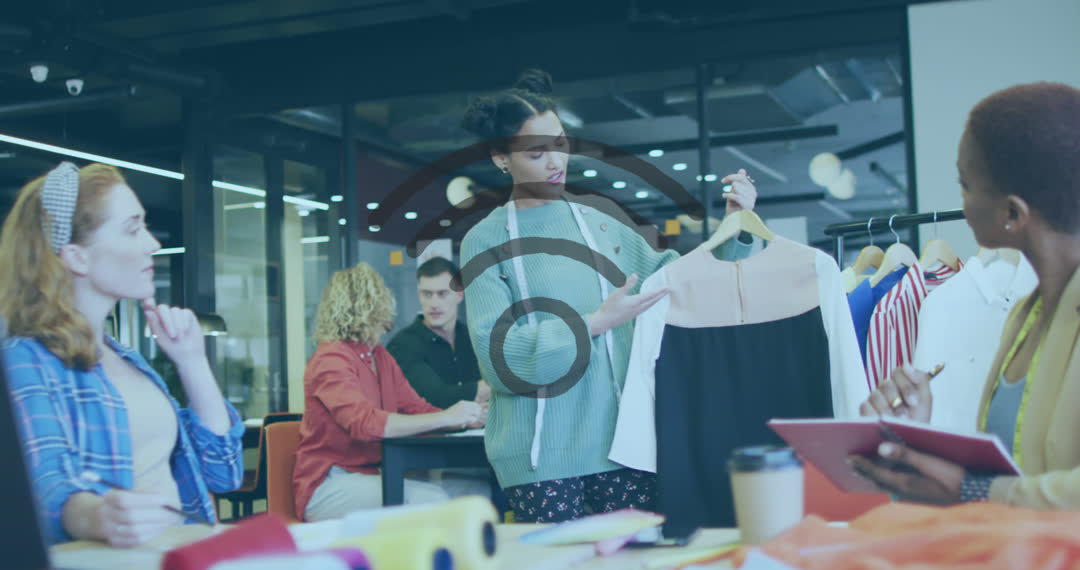 Team of diverse professionals is collaborating in a modern office, presenting and discussing fashion designs. Use for themes of creativity, teamwork in business, and fashion industry innovation. Overlay of WiFi icon suggests interplay of technology and work.