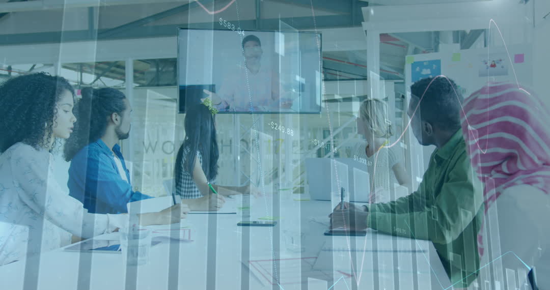 Creative professionals hold a meeting with a male colleague through a video link in a modern open workspace. The transparent screens with financial charts symbolize digital interface and global business communication. Ideal for illustrating remote collaboration in modern work environments, global business interactions, and the role of technology in facilitating teamwork across distances.