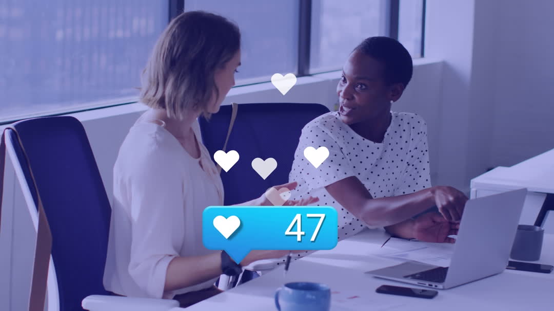 A diverse team of two businesswomen is focused on social media interactions within a modern office environment. This visually engaging scene, showcasing hearts and like notifications, represents the contemporary business world where digital technologies and online engagement play major roles. Ideal for use in articles about social media marketing, workplace diversity, team collaboration, and digital transformation in business processes.