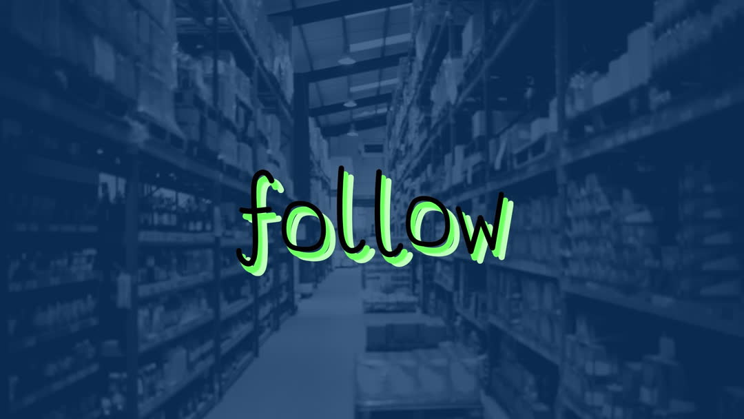 Creative animation presents 'follow' text overlay on blurred warehouse scene. Ideal for social media content, promoting following campaigns, enhancing branding efforts. Useful for e-commerce, digital marketing, and brand engagement concepts.