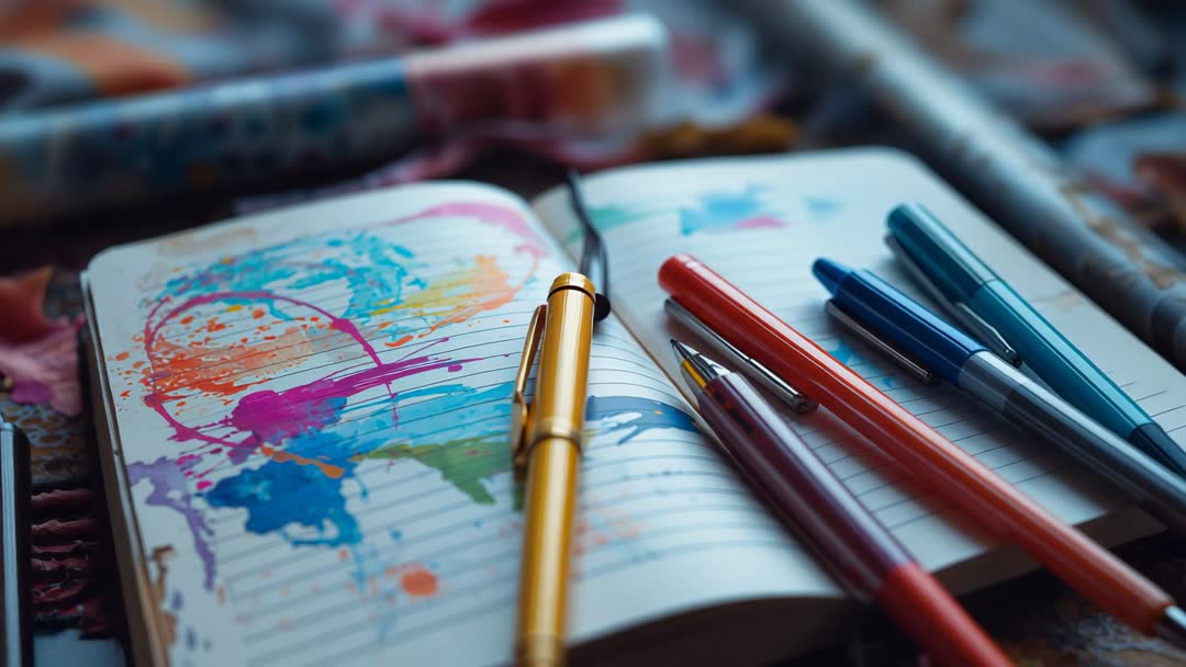 - Creative Workspace with Colorful Notebook and Art Supplies