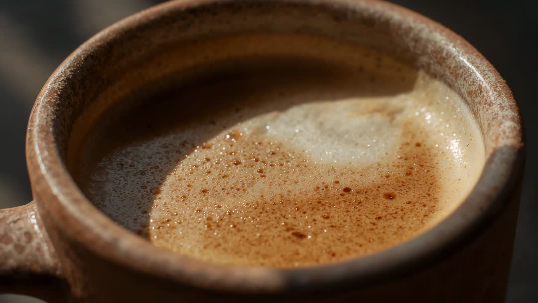 AI Generated Image. Showing slow-motion crema bubbling atop freshly brewed coffee in speckled stoneware mug, captured in tight macro closeup. Highlighting fine foam texture, tiny bubbles, and warm glaze reflections with shallow depth of field and soft side light. Working well for cafe branding, barista tutorial clips, recipe and beverage demo videos, social media reels, website hero banners, and packaging or label visuals. Serving as atmospheric B-roll for commercials, editorial stories on coffee culture, or loopable ambient footage for in-store displays and backgrounds. Allowing easy crop for vertical formats and close-up detail for print or digital layouts.