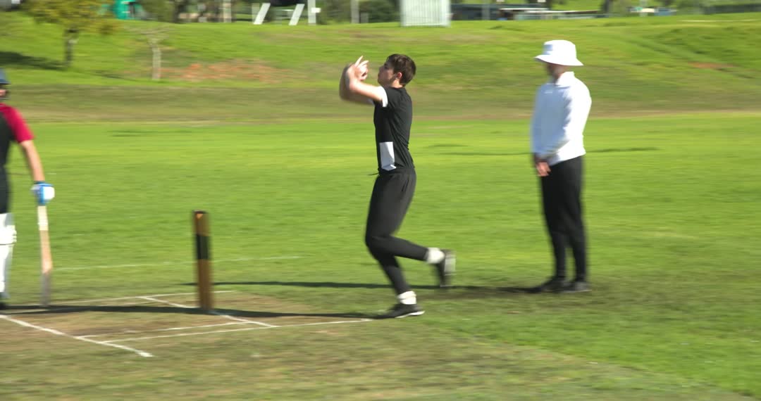Cricket Bowler in Action on Field with Vigilant Umpire Video