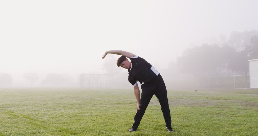 - Cricketer Stretching on Foggy Field for Morning Practice