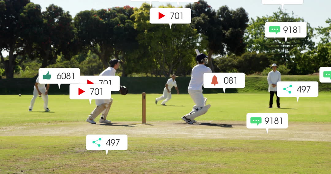 Cricketers engaging in a live match setup with multiple digital interactions overlayed, likely representing real-time social media metrics such as likes, shares, comments, and followers. This seamless integration of physical sports with virtual engagement highlights modern sports marketing trends and the fusion of digital platforms with traditional athletics. Its applications suit digital campaigns focusing on sports app promotions, interactive media innovations, and analytics tools targeting sports enthusiasts.