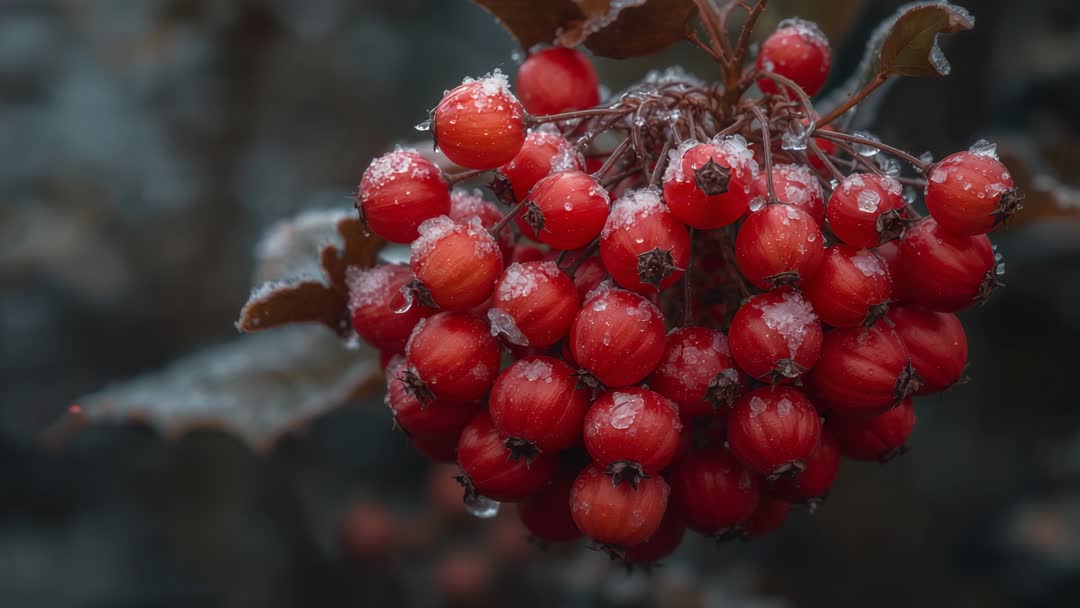 AI Generated Video. This clip showing closeup of crimson berry cluster thawing as frost melts into glossy water droplets. Shot with shallow depth of field, emphasizing rich red tones against cool muted background. Footage working well for seasonal storytelling, winter-to-spring transition, gardening and botanical content, holiday and nature-themed projects. Suitable for use as loopable background for websites, social media reels, product packaging, editorial spreads, and environmental documentaries. Recommended editing techniques including slowing speed for dramatic thawing effect, color grading to enhance red and blue contrast, adding subtle ambient music and gentle focus pulls. Delivering moody, tactile detail for campaigns highlighting resilience, seasonal change, freshness, and closeup nature study.