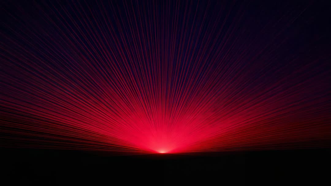 AI Generated Image. Looping abstract video showing radial crimson light burst rising from dark horizon and creating cinematic sunrise effect. High-contrast composition featuring central bright core emitting fine light streaks and shifting colors from deep purple to vivid red. Serving as title opener, music visualizer, event backdrop, stage projection, app splash screen, web hero background, sci-fi montage, and promotional reel. Allowing easy looping and blending with overlay text or logo using screen or additive blending modes. Supporting color grading to match brand palette and layering with particle effects or additional lens flares. Delivering moody, futuristic atmosphere for tech presentations, electronic music videos, meditation visuals, and cinematic trailers.
