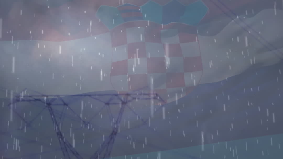 Visualization features Croatian flag with electricity pylons beneath rainfall, blending national pride with technological sophistication. Abstract, futuristic digital displays suggest data analytics and financial projections context. Ideal for conveying themes of national advancement, integration of traditional and modern elements, power and energy sectors, or historical significance of progress.