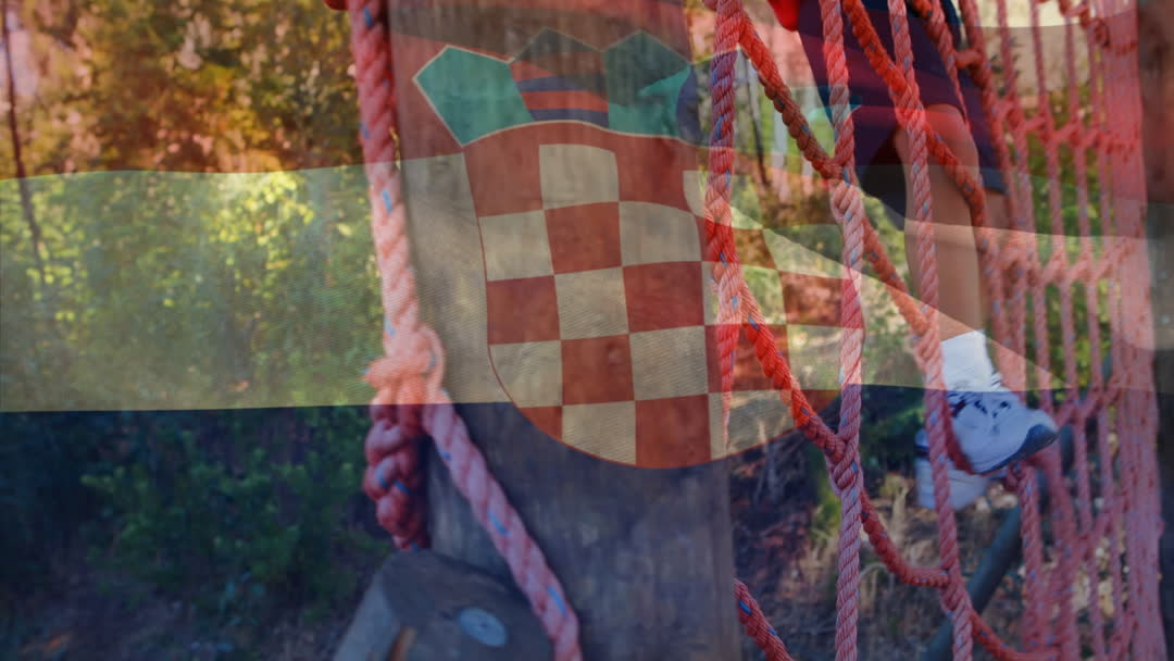 Scene combines vibrant video of Croatian flag with active child on obstacle course. Reflects themes of national pride and physical challenge. Ideal for sports events promotion, outdoor adventure content, cultural stories emphasizing youth and nationalism.