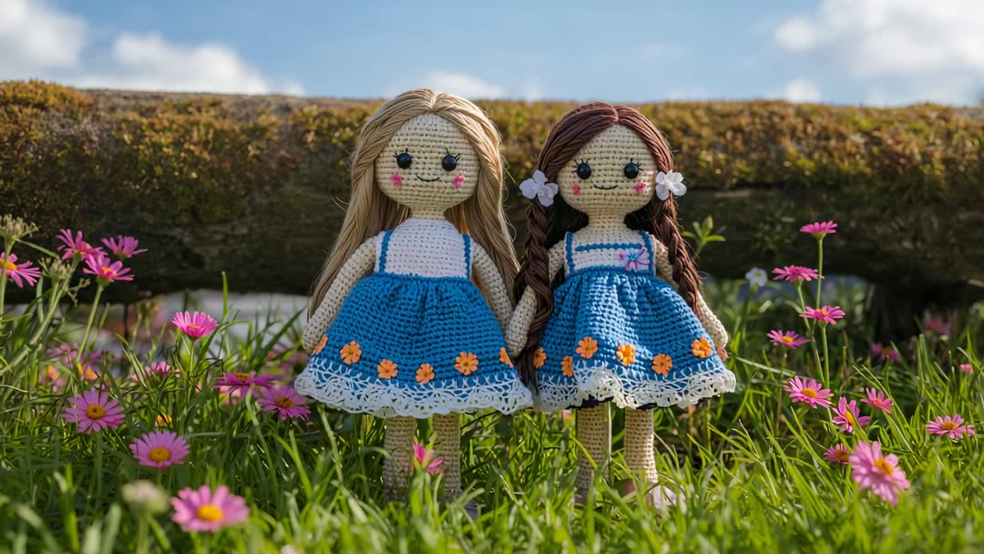 AI Generated Video. Video captures charming, crocheted dolls in blue dresses amidst vibrant pink daisies, evoking feelings of innocence and creativity. Ideal for children's entertainment, promotion of handmade crafts, or creative storytelling based on dolls' adventures in nature.