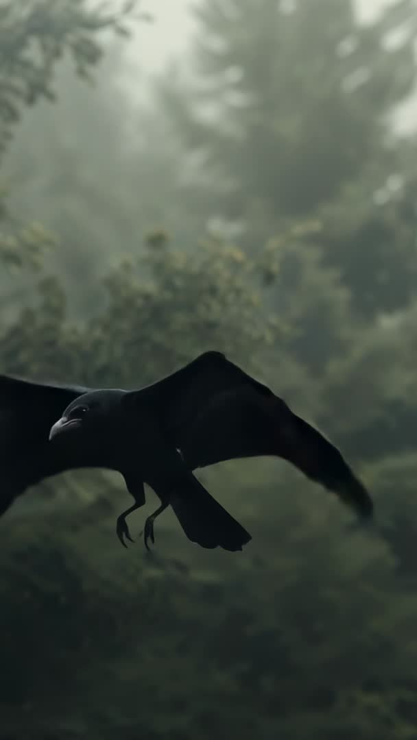 - Crow swooping through foggy pine forest vertical wildlife video with talons and wingbeat
