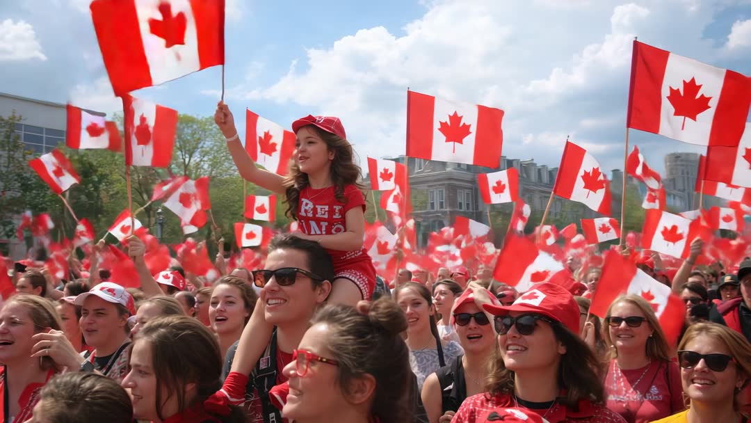 AI Generated Video. Featuring large crowd celebrating Canada Day in city plaza, child on shoulders waving Canadian flag and people wearing red and white. Capturing energetic patriotic atmosphere with flags fluttering, faces smiling, and crowd cheering. Suited for event promotion, tourism campaigns, national holiday coverage, social media reels, broadcast segments, and civic presentation. Offering wide and medium shots for editing, looping background use, or headline opener with soundtrack of anthem or ambient crowd noise. Ideal for brand campaigns targeting Canadian audience, editorial packages about national celebrations, classroom resources on cultural traditions, and community festival highlight reels.