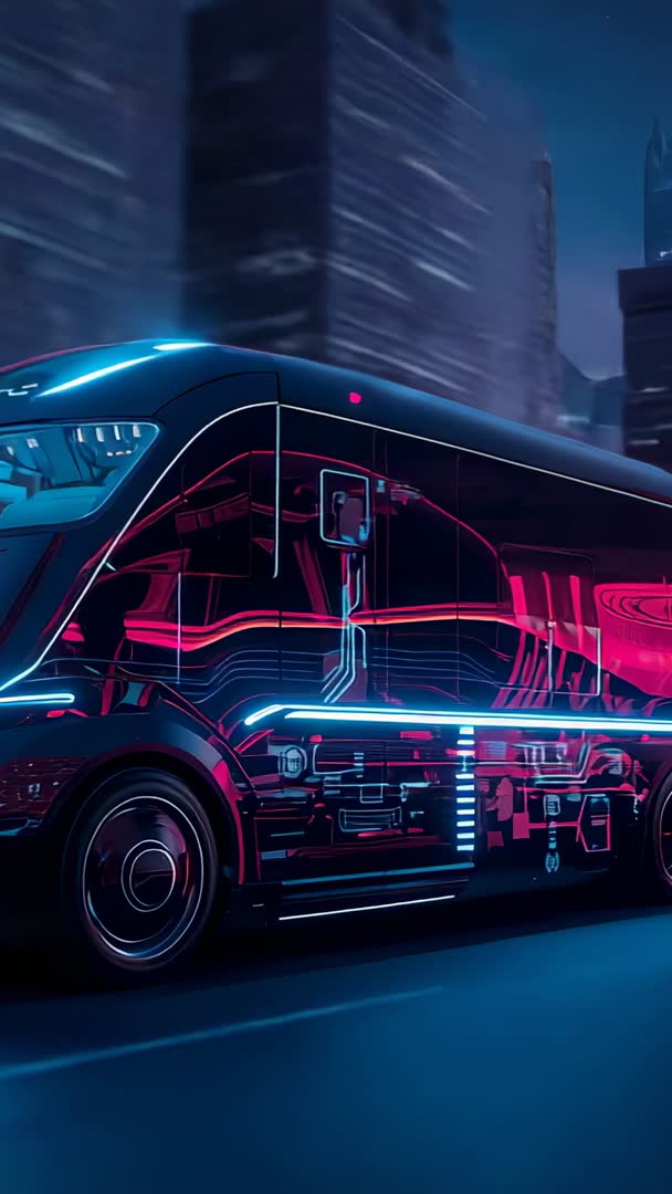 AI Generated Image. Featuring sleek neon-lit bus cruising through futuristic metropolis at night, pulsing circuit-like light trails and rotating wheels creating dynamic motion. Vertical framing optimizing mobile and social delivery, delivering immersive portrait experience for reels, stories, and vertical ads. Color palette combining magenta, cyan, and deep blue, producing cyberpunk mood and high-tech vibe. Useful for promoting electric or autonomous vehicles, supporting tech launch campaigns, enhancing sci-fi trailers, powering music video backgrounds, and illustrating urban mobility concepts. Ready for looping as animated background, combining with motion graphics overlays, lower thirds, and product callouts. Ideal for digital marketing, app intros, website hero sections, event visuals, futuristic editorial, and pitch decks.