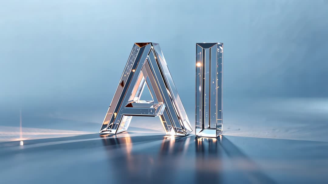 AI Generated Image. Featuring crystal AI letters crafted from faceted glass, reflecting warm highlights and cool blue tones while tiny internal sparkles animate inside letter forms. Showing moving point light traveling across glossy blue floor and leaving soft reflective streaks and long dynamic shadows. Delivering sleek minimalist visual for tech brand intros, logo reveals, product demos, website hero banners, social media promos, and corporate presentation openers. Offering clean background and strong negative space for headline overlay, text animation, or lower third graphics. Providing high-end luxury tech vibe for AI, machine learning, software, hardware, and creative studio projects. Editing tips: use slow crossfade, subtle lens flare, or cinematic color grade to enhance crystal reflections and inner sparkles. Suggested formats: 4K cinematic, loopable short, or logo sting for broadcast and digital platforms.