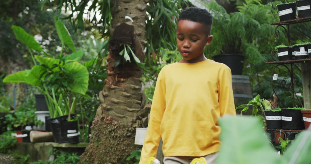 A young African American boy enjoys exploring a vibrant garden greenhouse, surrounded by various potted plants and lush greenery. Perfect for projects focusing on nature exploration, ecological education, or promoting environmental awareness.