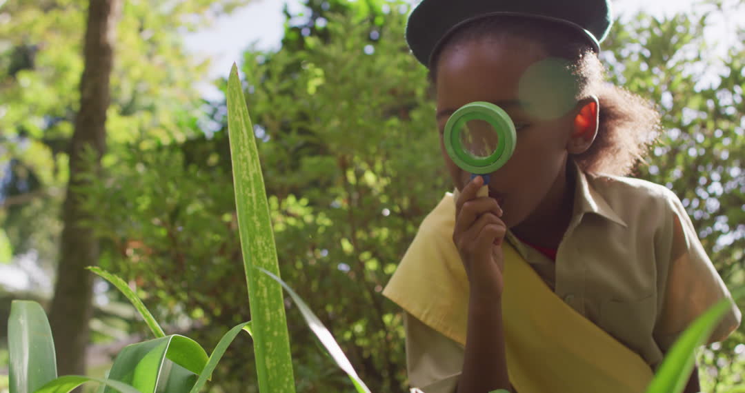A young African American girl wearing a scout outfit uses a magnifier to explore plants in a lush garden. This scene encapsulates the excitement and curiosity of childhood exploration and the joy of learning outdoors. Perfect for use in campaigns promoting children's education, outdoor activity programs, scouting groups, or leisure and science hobbies.