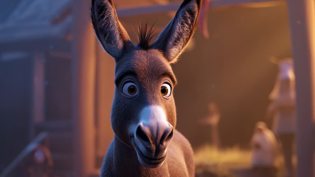 AI Generated Image. The scene depicts an animated donkey tilting its head as it listens to a distant sound in a warmly lit stable with surrounding hay bales. It suggests a setting on a traditional farm, capturing a charming and playful countryside ambience. This animation can be used to enhance stories about rural life or as part of an animated film with pet and farm themes. Its depiction conveys curiosity and adds character, ideal for family animations and educational animations for children.
