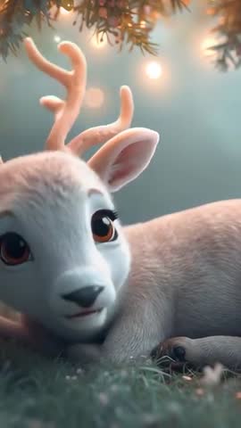 AI Generated Video. Vertical short video featuring curious fawn discovering fairy lights in enchanted forest, lifting head and opening eyes while showing delicate antlers. Warm glow and soft focus creating cozy, magical mood ideal for family-friendly storytelling and seasonal campaigns. Perfect for creating children's content, bedtime story intros, app splash screens, greeting card animations, and short-form social ads. Vertical format working for Instagram Reels, TikTok, YouTube Shorts, and mobile ads to maximize engagement on phone screens. Close-up framing and expressive eyes drawing viewer attention and building emotional connection for educational nature clips and whimsical branding projects.