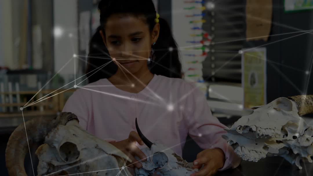 This visual captures a young student engaging actively with animal skulls in an educational setting, highlighting curiosity and hands-on scientific curiosity. Ideal for promoting school science programs, educational initiatives, or materials on experiential learning in child development.