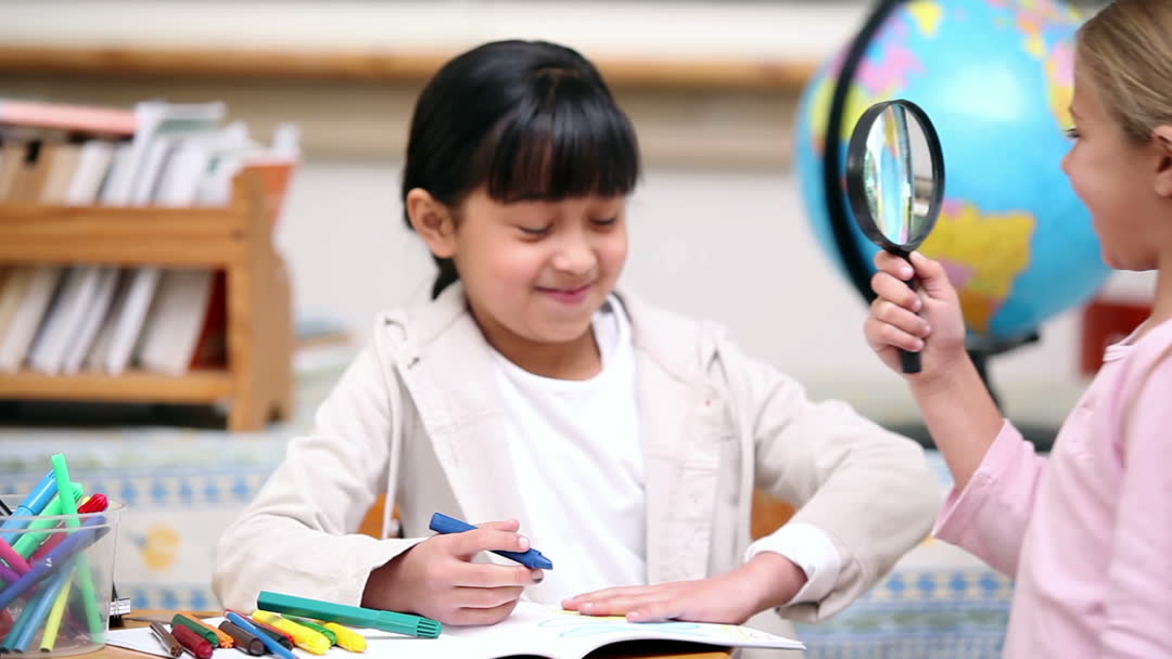 Young students in a classroom are engaged in a learning activity involving a magnifying glass, fostering curiosity and excitement among them. The video signifies a playful approach to education, emphasizing hands-on learning and exploration. Use this for educational content, school advertisements, or child development websites to highlight inventive learning environments.