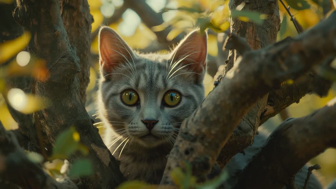 AI Generated Image. AI-generated depiction of a tabby cat nestled within tree branches, capturing an autumnal theme that evokes a sense of curiosity. Ideal for use in pet care articles, relaxing-themed content, and wildlife photography collections.