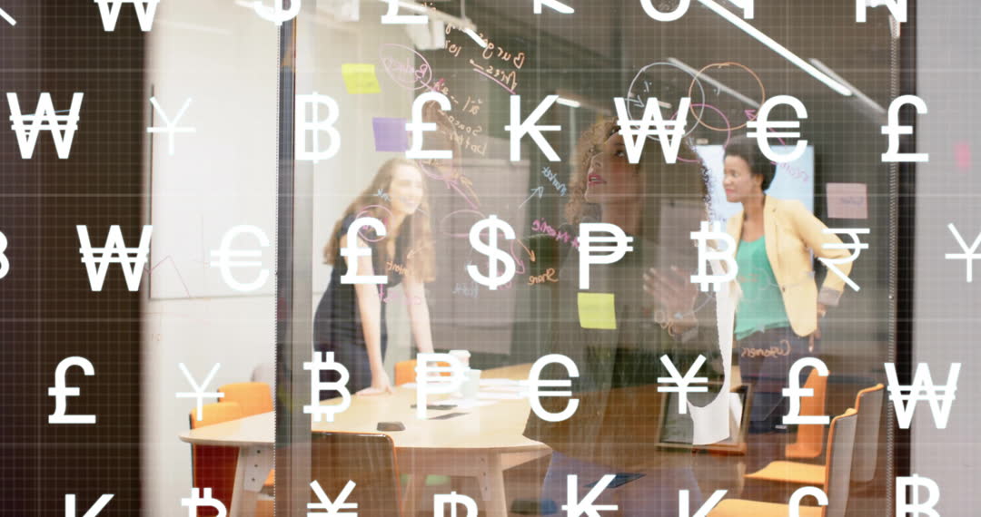 Currency Symbols Overlay on Diverse Business Meeting Video