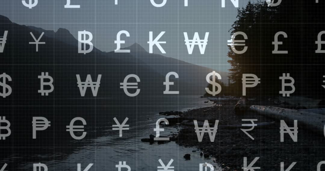 - Currency Symbols Overlay on Serene Mountain Lake Background