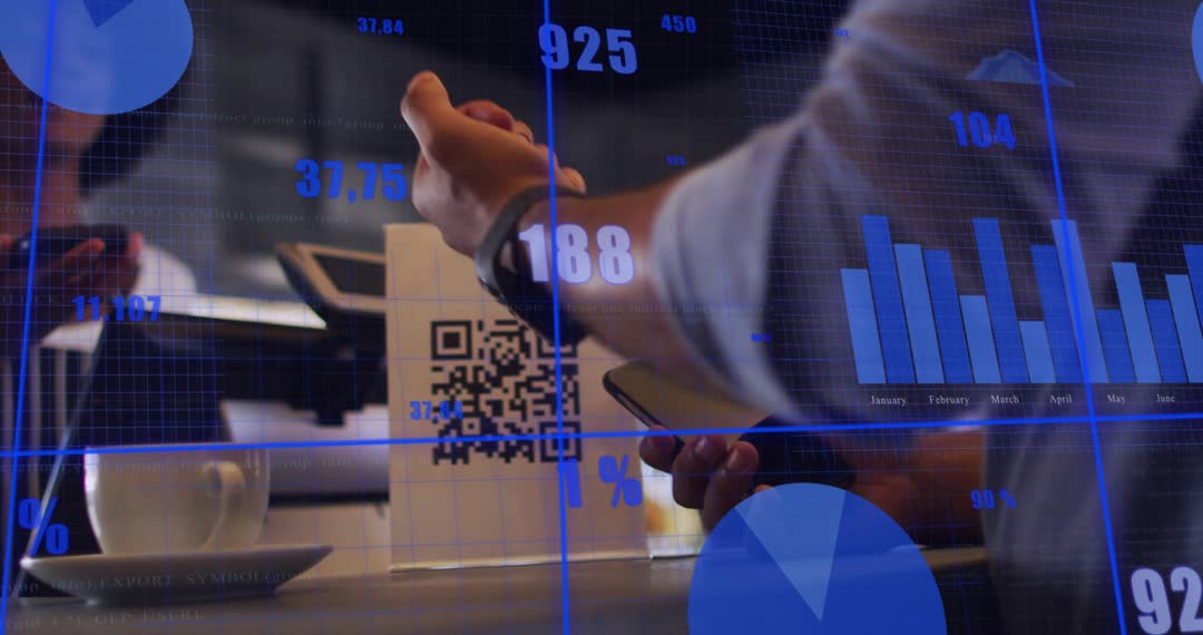 Video clip showing customer scanning QR code with smartphone at cafe counter while blue analytics overlay displaying charts and numeric data. Camera focusing on hand movement and mobile screen interaction, cashier operating point-of-sale terminal in background. Visual combining real-world transaction with digital analytics, conveying contactless payment flow, mobile commerce trends, and sales tracking. Suitable for fintech marketing, mobile wallet tutorials, POS product demos, cafe branding, business presentation slides, social media ads, and on-site training videos. Editing ideas include slow-motion close-up to emphasize gesture, animated data callouts to sync with overlay, voiceover explaining secure checkout steps.