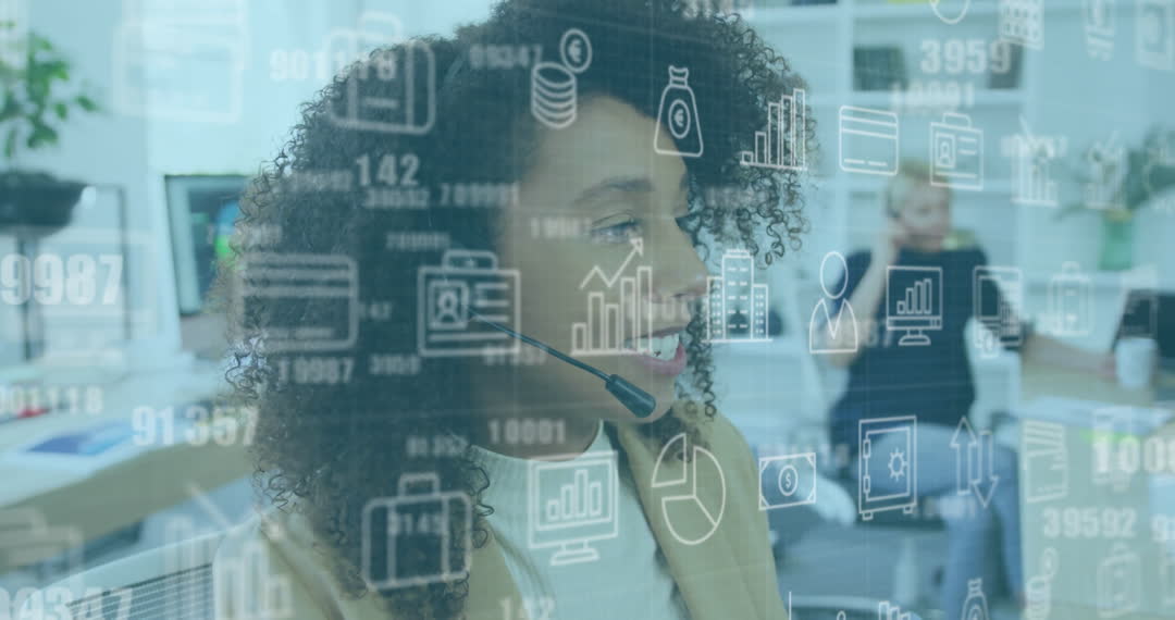 Multiracial female call center agent wearing headset, surrounded by digital illustrations of graphs and analytics symbols. Double exposure technique highlights blend of customer support with data analysis. Useful for illustrating themes of technology integration in business communication, data-driven decision making, or modern working environments.