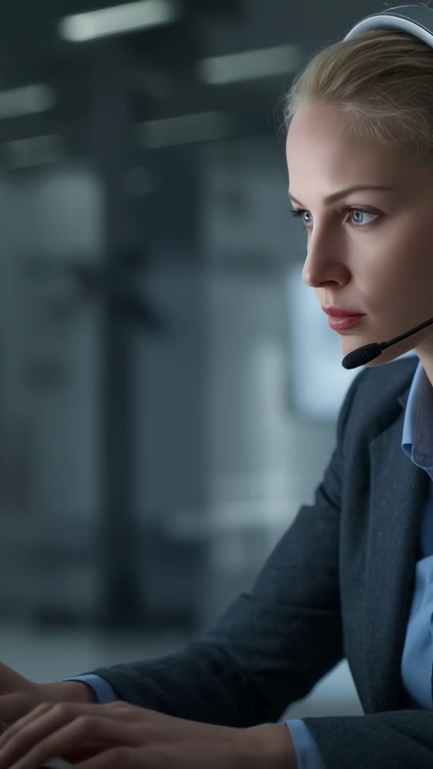 AI Generated Image. Close-up vertical video showing focused female customer service agent wearing headset and typing on keyboard with blurred modern office background and generous copy space for text overlay. Cool professional tones creating polished corporate mood and strong sense of concentration. Ideal for use in website hero banners, contact support pages, customer service onboarding videos, recruitment ads, social media vertical ads, mobile app hero screens, training modules, and corporate presentations. Recommend placing logo and headline in left-side copy space and using 9:16 crop for reels and stories. Footage fitting B2B SaaS marketing, call center promotion, helpdesk tutorials, customer experience articles, and internal training materials.