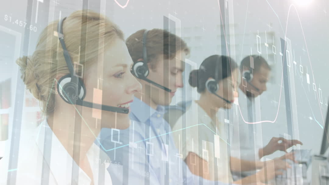 Group of customer service agents wearing headsets, sitting in a modern office environment. Overlays of financial data and digital graphics suggest focus on technology and data-driven communication. Suitable for illustrating concepts of global communication, financial consultations, tech support, and data-driven service processes.