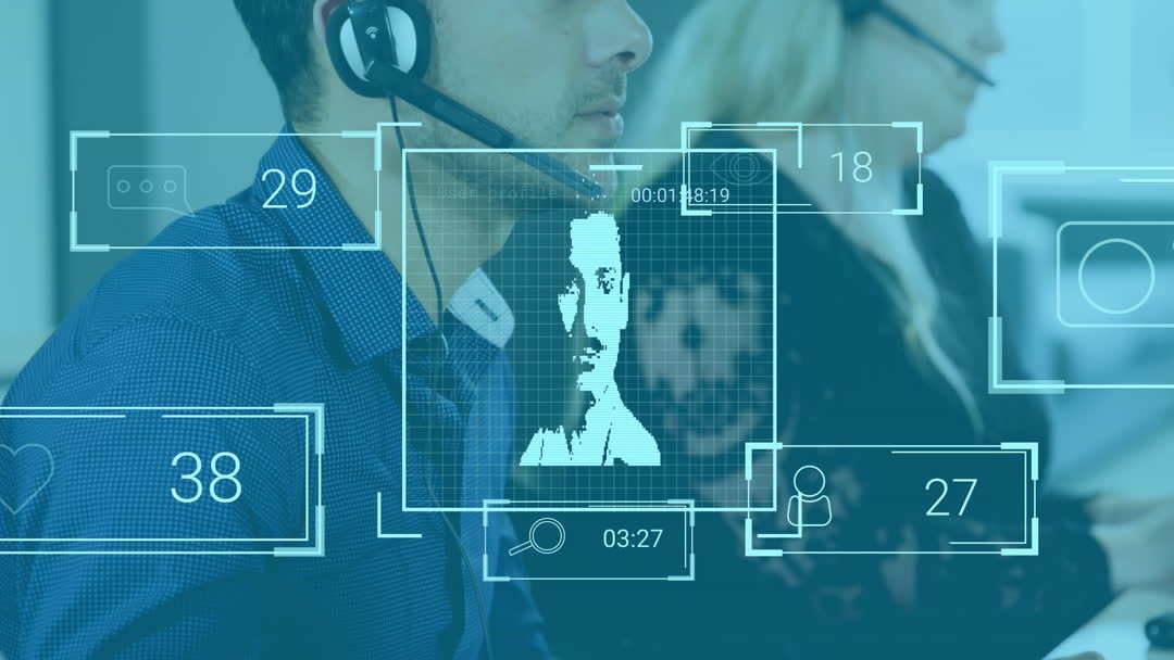 Image shows business professionals wearing headsets, focused on digital interface projections indicating tech-driven communication. Ideal for showcasing innovation in customer service, tech support, and digital workplace solutions or illustrating data management and analytics concepts.