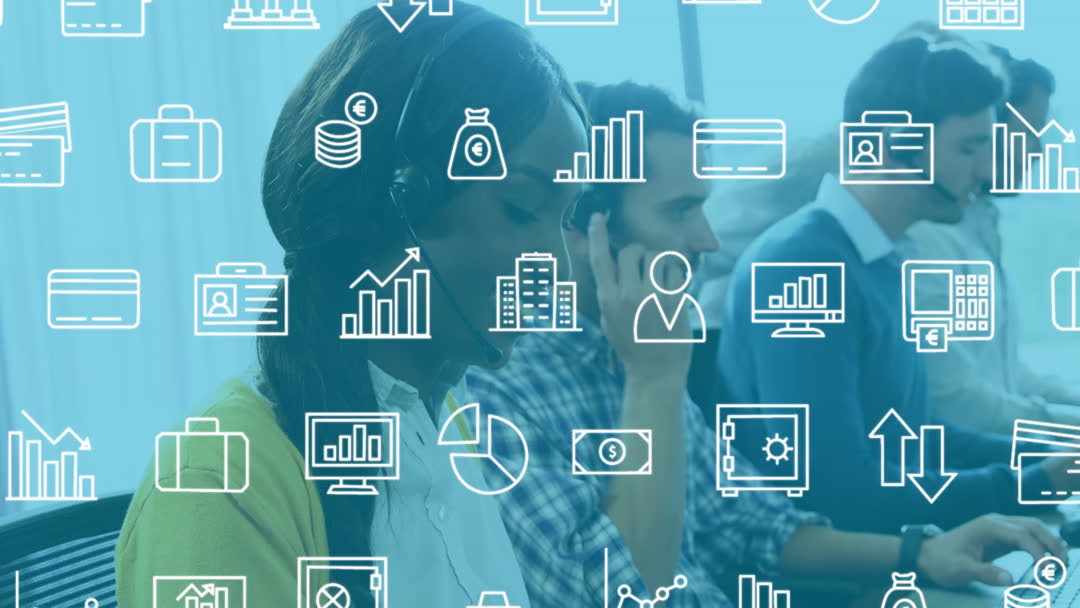 Customer Service Team Engaged with Digital Icons Overlay Video