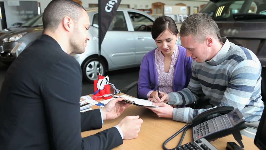 Customers, a couple, seen across car dealership sitting with a salesman conducting contract signing process. Buying experience and formal agreement setting denote successful deal. Ideal for automotive marketing, dealership promotions, business transactions, or finance-related visuals.