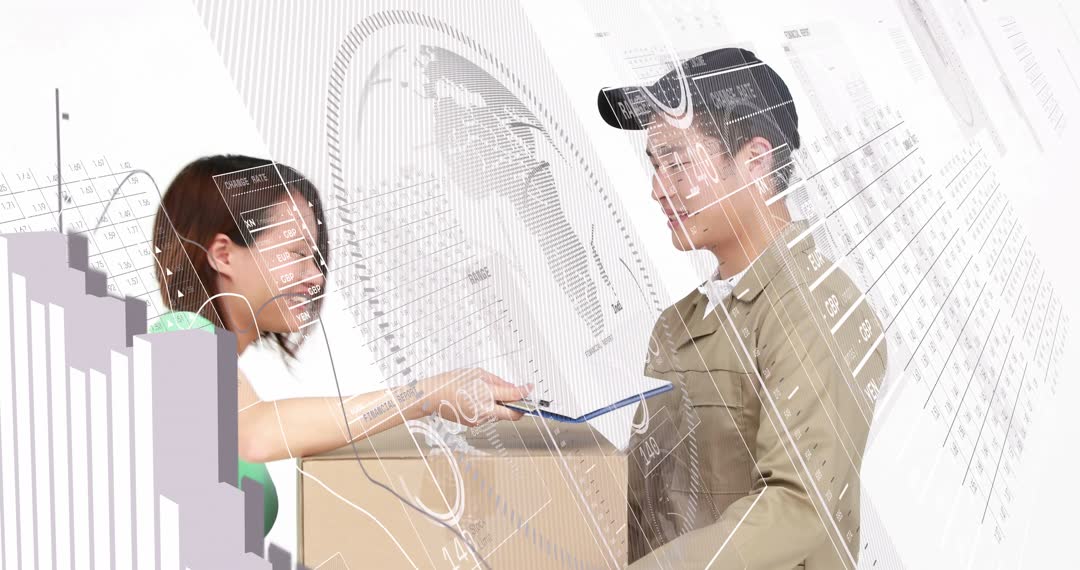Video clip showing customer signing delivery receipt while courier handing over box with clipboard. Transparent charts, world map and analytics graphics overlaying scene, conveying data-driven logistics and delivery tracking. Footage working well for e-commerce brand ads, last-mile delivery promotions, courier service websites, logistics platform demos, and shipment tracking interfaces. Use for social media ads, explainer videos, onboarding and training clips, corporate presentations, or investor pitches. Crop-friendly composition and clean studio background providing room for headline text, lower thirds, or overlayed UI elements.