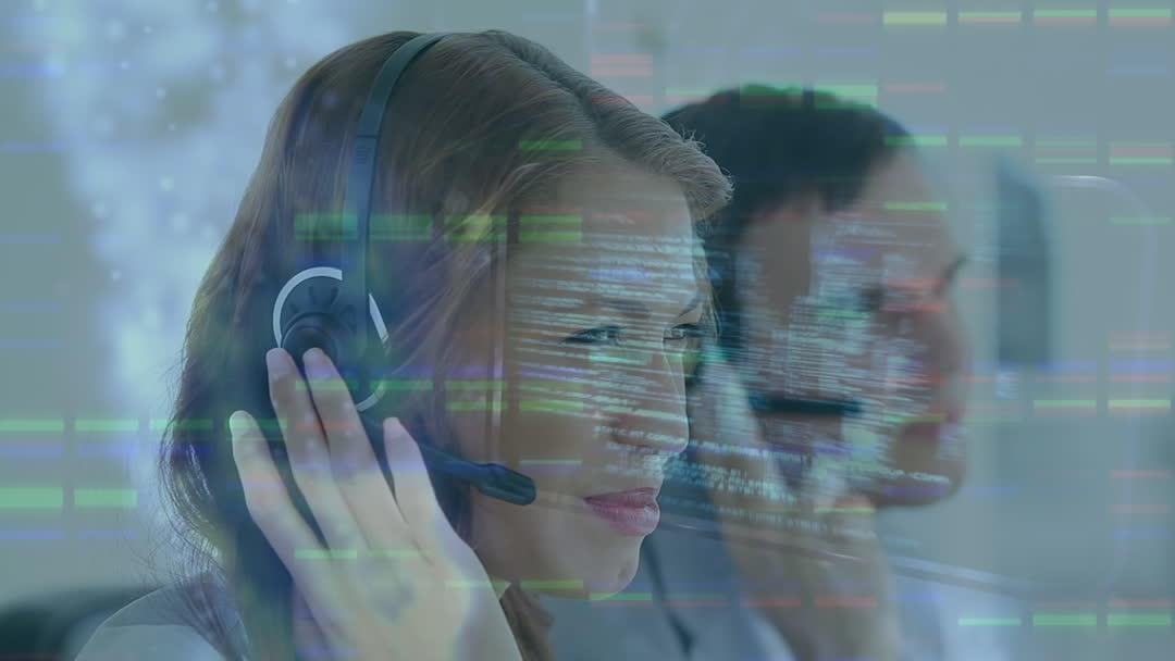 The scene shows customer service operators using headsets while a digital data overlay suggests advanced technological integration at work. This combination of professional human interaction and innovation across technical fields indicates progress in customer support methods. Useful for illustrating cutting-edge services in telecommunications, showcasing modern call-center settings, or advertising innovative customer support solutions.