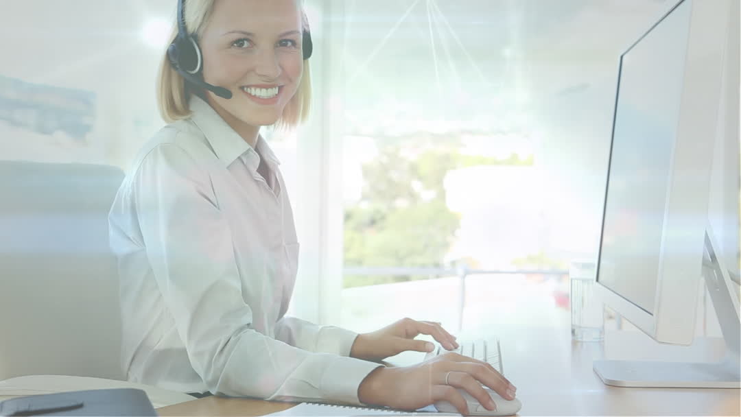 Smiling customer support agent using a desktop while wearing a headset, indicating engagement in communication through professional call center duties. The backdrop includes interconnected dots suggesting digital technology and connectivity. Useful for business, technology, communication, and customer service content, highlighting modern tech and professional service aspects.