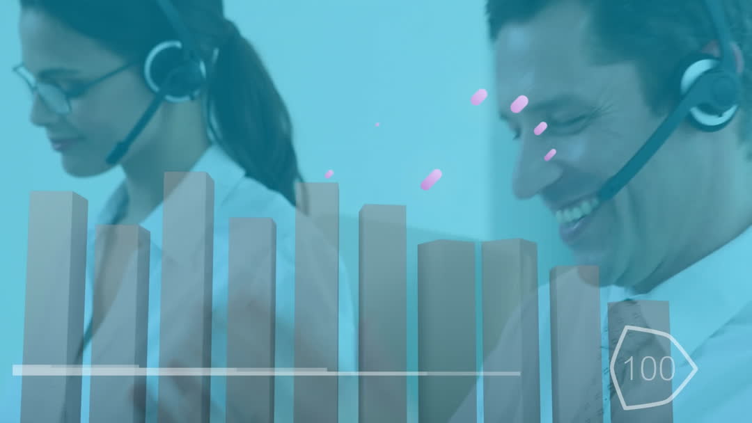 Customer service representatives using headsets while engaging with callers, with superimposed graphics symbolizing data analysis and communication flow. Suited for concepts involving corporate communication, business analytics, technology in business, and global customer support. Useful in articles about the benefits of technology in call centers or visual content promoting professional and efficient customer service teams.