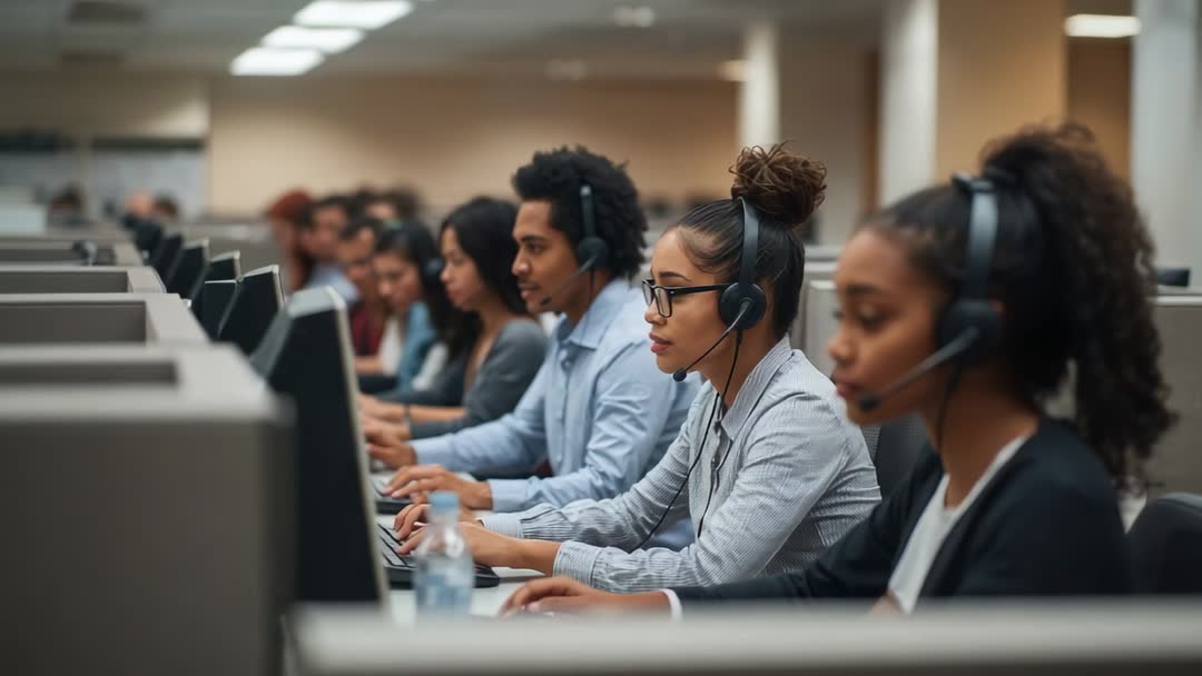 AI Generated Image. Short video clip showing rows of call center agents wearing headsets and typing on keyboards, camera pulling back to reveal busy cubicle floor. Foreground featuring focused agents speaking into headsets, midground and background showing team collaboration and workstation rows. Lighting using soft fluorescent office light, shallow depth of field creating cinematic focus on on-screen agent. Useful for corporate training, customer service presentations, BPO marketing, website hero banners, recruitment ads, internal communications, and newsroom segments about customer experience. Licensing options suitable for commercials, e-learning modules, webinar intros, and social media campaigns. Editing suggestions: cutting to close-ups for testimonial sequences, adding subtitles for phone dialogues, overlaying lower third for job title or contact info.