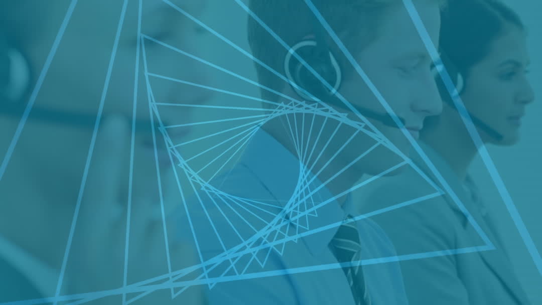 Team of professionals engaged in communication while using headsets, partially covered by abstract geometric patterns. Represents concepts of global business networking and data processing technology. Suitable for illustrating modern communication networks, digital teamwork, and abstract business solutions in technology marketing platforms.