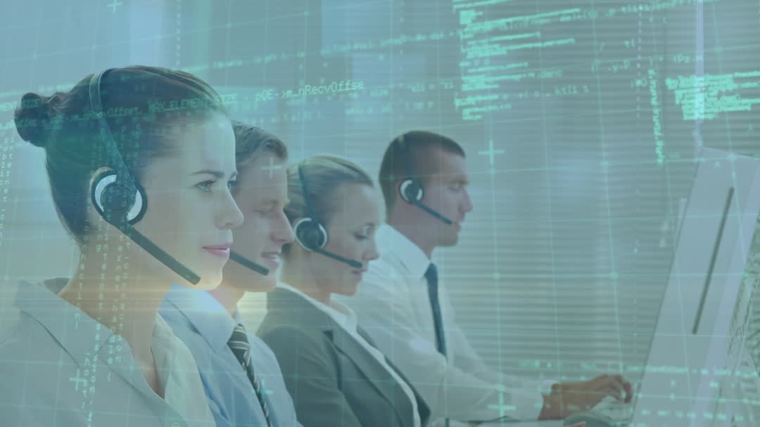 Business professionals in a call center environment using headsets while engaging with digital data interfaces. Useful for illustrating concepts of customer service, technological advancements in data processing, or team collaboration in modern business contexts.