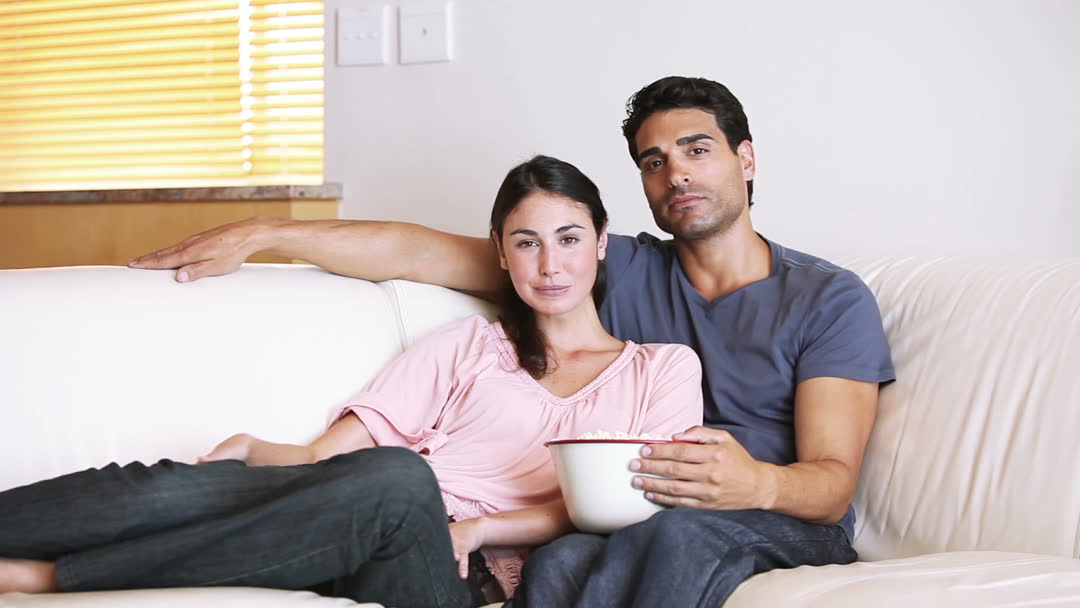 - Cute Couple Relaxing on Couch Watching TV with Bowl in Hand