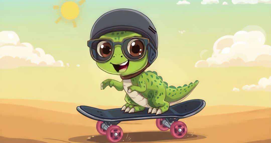 AI Generated Image. A vividly illustrated lizard character enthusiastically skateboarding across sandy desert dunes as the sun begins to rise, giving the scene an exhilarating sense of adventure. The character sports an adaptive human persona with oversized sunglasses and a protective helmet, making for a lively, imaginative, and encouraging depiction. Useful in children's adventure stories, educational videos, or illustrations promoting exploration and outdoor playfulness.