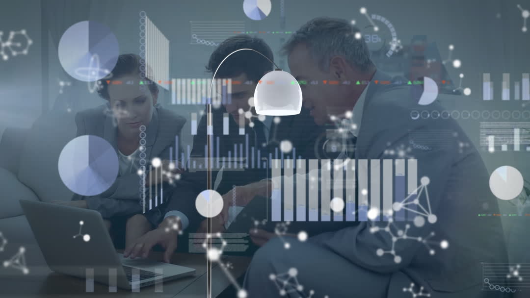 Illustrating modern business dynamics, this depicts professionals collaborating with advanced charts and graphs overlaying their workspace. It is suitable for use in contexts involving business technology, corporate strategy meetings, or digital transformation initiatives.