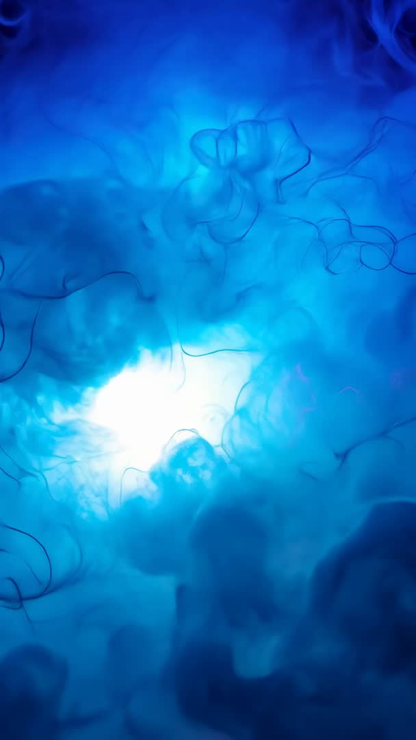 AI Generated Video. Video showing cyan-blue core emitting dye plumes and delicate tendrils diffusing through water. Backlit turquoise and violet hues creating glowing center and translucent layers. Macro perspective revealing fluid textures, soft gradients, and organic motion. Vertical 9:16 composition optimized for mobile stories, reels, and vertical ads. Use as background for title screens, music visuals, product promotions, app intros, science and art content, meditation and wellness pieces, or motion graphics overlays. Loop-friendly and slow-motion friendly for seamless repeats and calming visuals. Suitable for color grading tests, visual effects references, and creative abstract media.