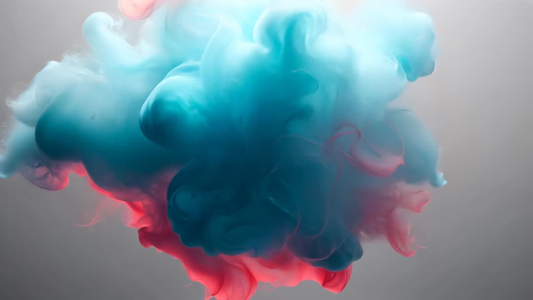 AI Generated Image. Footage showing cyan and pink ink clouds billowing and swirling underwater in slow motion, creating translucent plumes and soft gradients against neutral gray backdrop. High-speed capture revealing fluid diffusion, eddies, and curling tendrils with vivid cyan and magenta tones merging into pastel washes. Suitable for use as background element in motion graphics, title sequences, and music video overlays. Working well for product promos, beauty campaigns, social media content, and creative branding projects. Clip offering easy looping potential, color grading flexibility, and layered compositing options for editors and visual artists.
